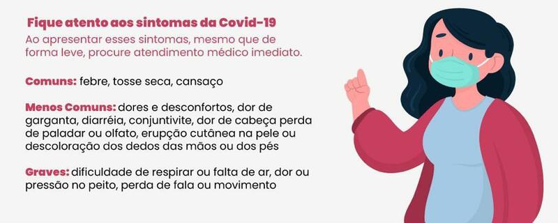 Se você sentir febre, cansaço, dor de cabeça ou perda de olfato e paladar procure atendimento médico. A recomendação do Ministério da Saúde é que a procura por ajuda médica deve ser feita imediatamente ao apresentar os sintomas, mesmo que de forma leve. Após a vacinação, continue seguindo os protocolos de segurança. Entre eles, use máscara de pano, lave as mãos com frequência com água e sabão ou álcool 70%; mantenha os ambientes limpos e ventiladores e evite aglomerações.